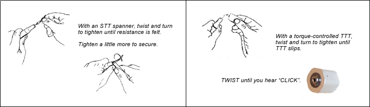 | STT Spanner Match the key part of the tool with the parallel stem part of the tip and move the STT down to tighten the tip until resistance is felt (end of the thread). Continue tightening a little more to secure. DO NOT OVERTIGHTEN. |